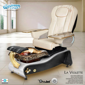 The Gulfstream La Violette is a luxurious and customizable pedicure spa chair designed for salons seeking high-end functionality and design. This chair comes with a variety of options, including upholstery in black, grey, pearl white, or chocolate, and customizable edge and base finishes. It also offers a range of features aimed at enhancing comfort and aesthetic appeal.