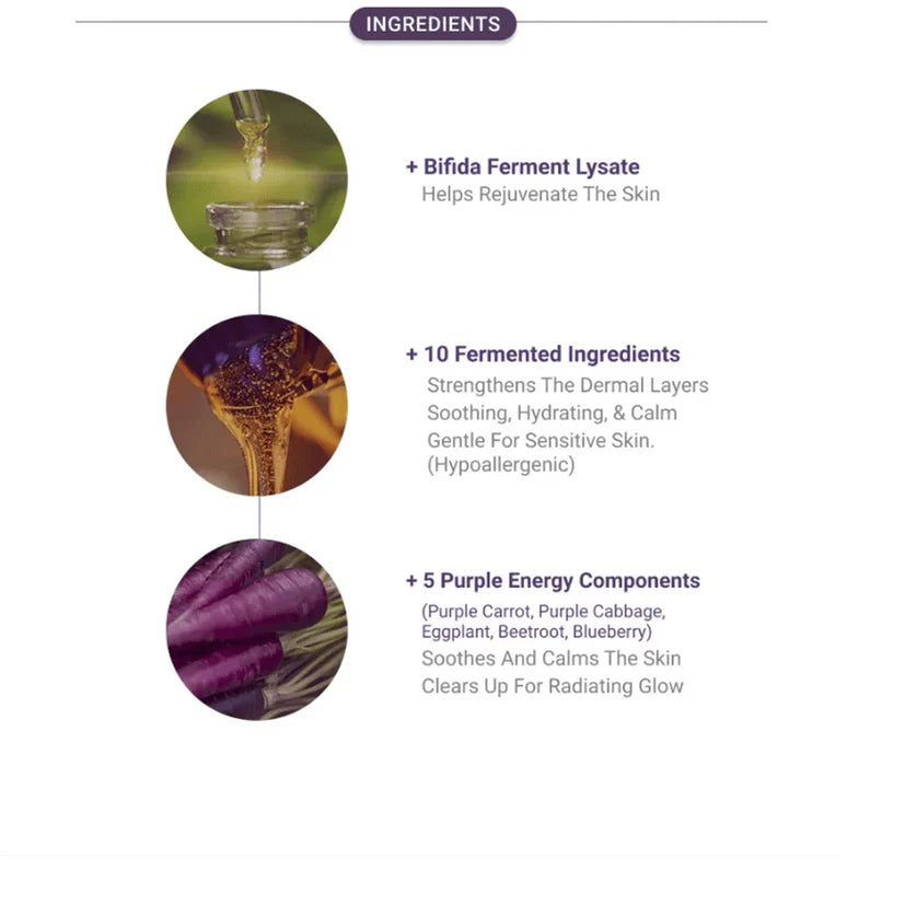 - Lactobacillus/Soybean & Punica Granatum (Pomegranate) Ferments – Contribute anti-aging and brightening effects.